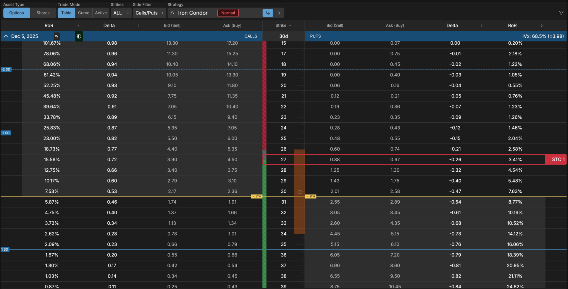 Selling the 27-strike cash secured put pays 3.4% for the month, and getting assigned at that level would be a gift.