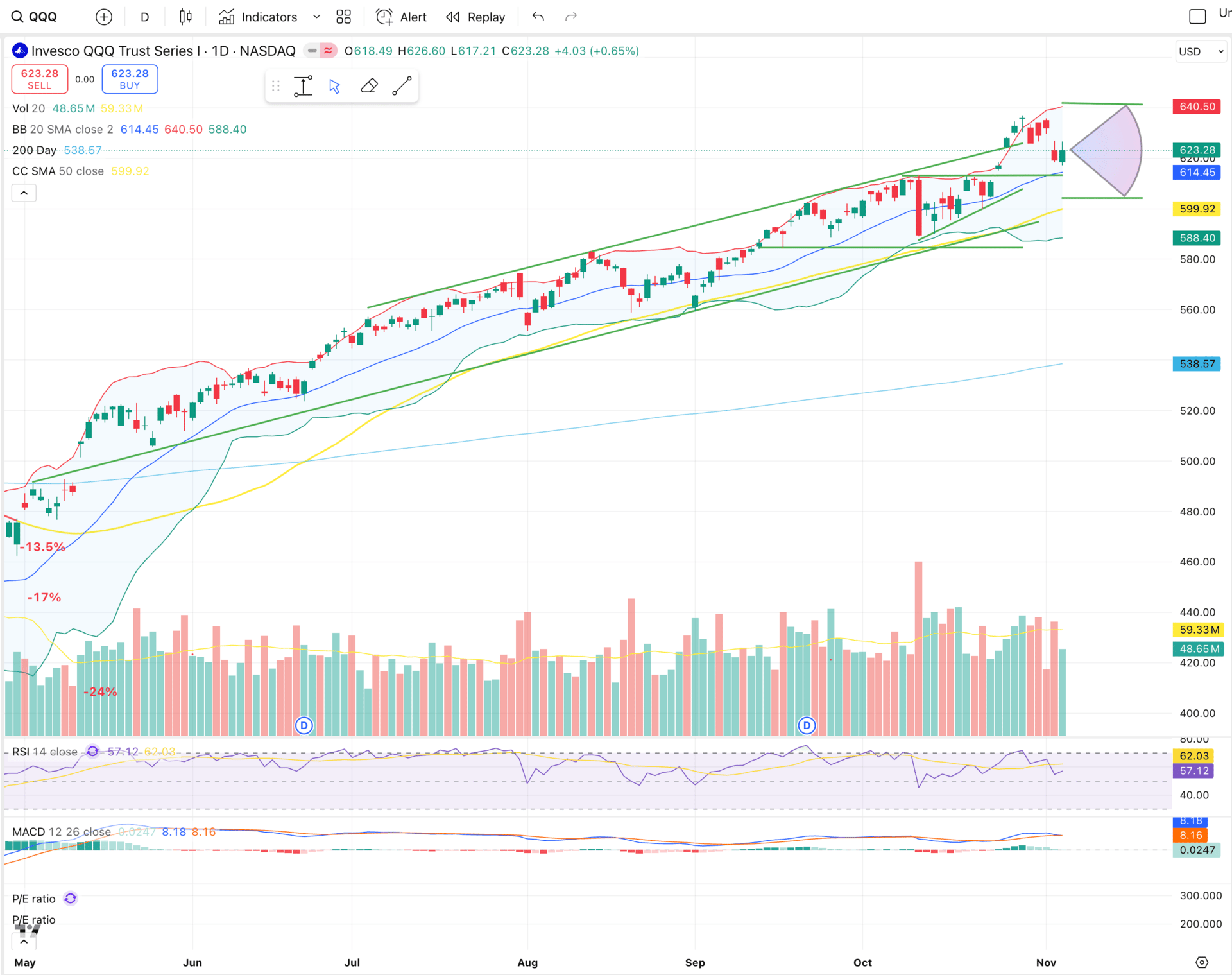 At this point, I’m neutral to bullish. The expected move on QQQ for the next two weeks is about 20 points in either direction, which means we could see a range between 600 and 640. That’s a wide window, but it gives us opportunity both ways.