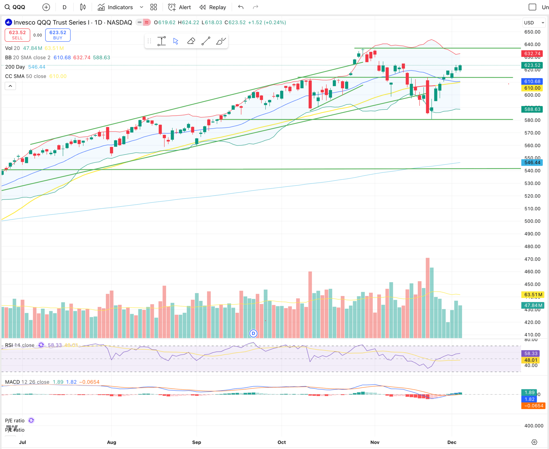 QQQ continuing bullish crossover on MACD heading towards upper bollinger band