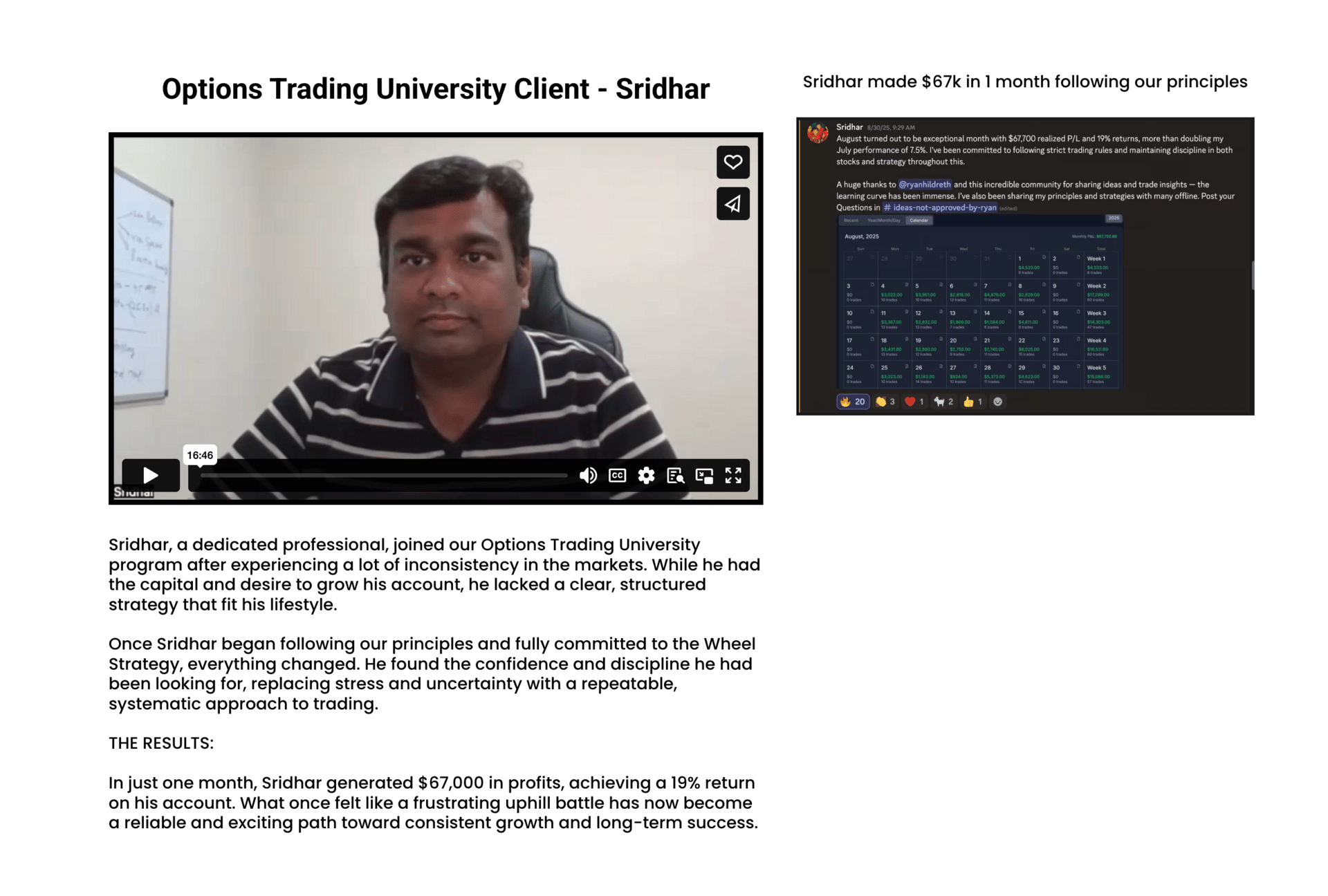 This week we’re highlighting our client Sridhar, who joined us a few months ago and made $67,000 in his first month following the principles.