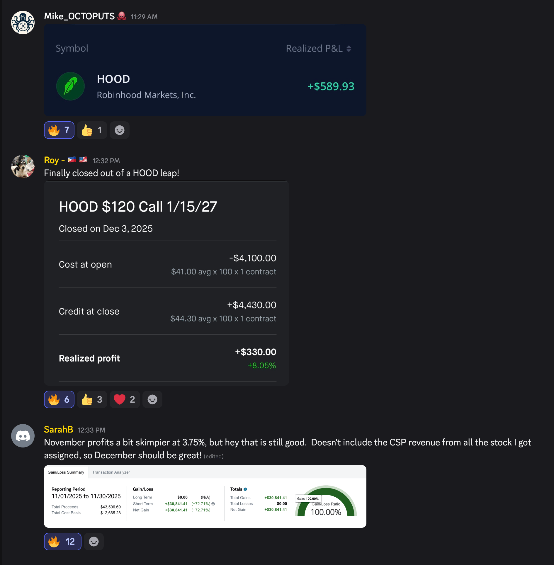 We also had Mike close out a $589 win today and Sarah finish her November with a $30,000 profit, which equated to a 3.75 percent ROI in her portfolio.