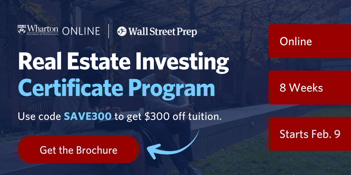 The Wharton Online + Wall Street Prep Real Estate Investing & Analysis Certificate Program is an immersive 8-week experience that gives you the same training used inside the world’s leading real estate investment firms.