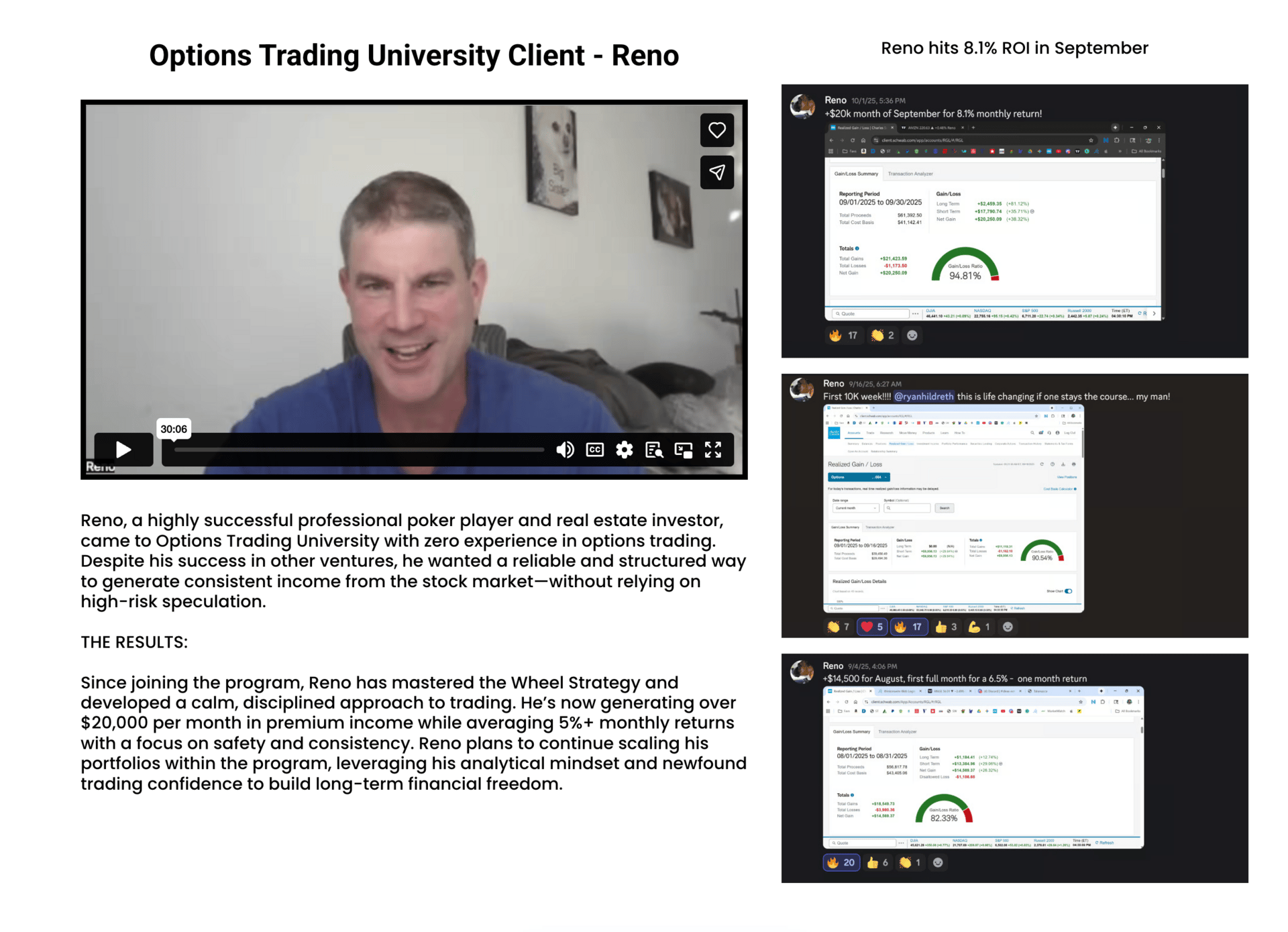 We had the pleasure of interviewing Reno, a highly successful professional poker player and real estate investor. Since joining the program, he’s been consistently generating over $20,000 per month and achieving more than 5 percent monthly returns. In September, he hit a record 8.1 percent month.