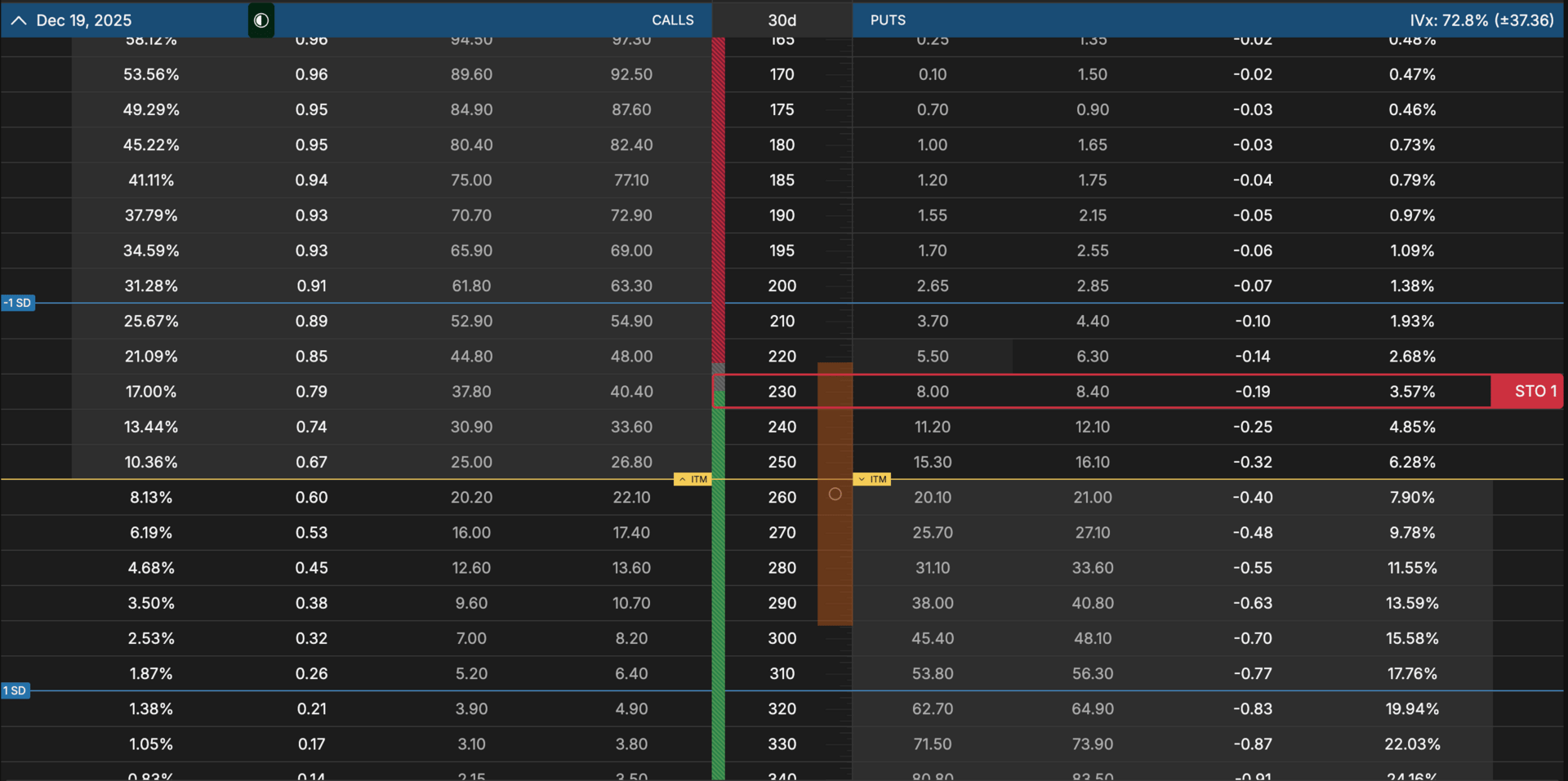 Risk: Assignment risk at the 230 level if STX trades below your strike