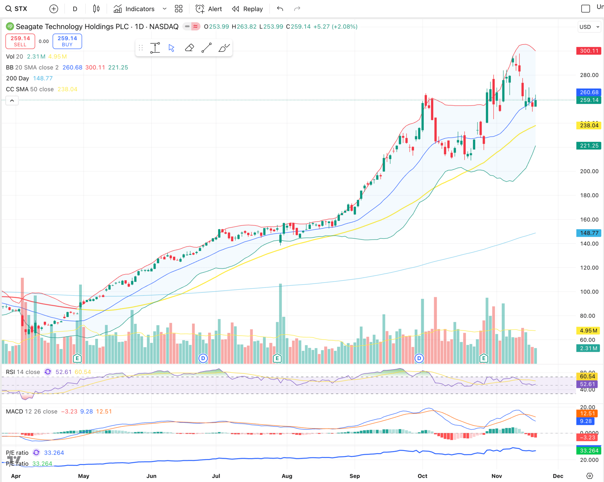 Seagate Technology is becoming an increasingly important player in the AI hardware ecosystem as data centers require more storage capacity to support massive GPU clusters. With a low P/E of 33 for an AI-adjacent business and a strong long-term trend, STX offers a clean premium setup even after its recent pullback. This is a new addition to the portfolio and a straightforward trade to execute.