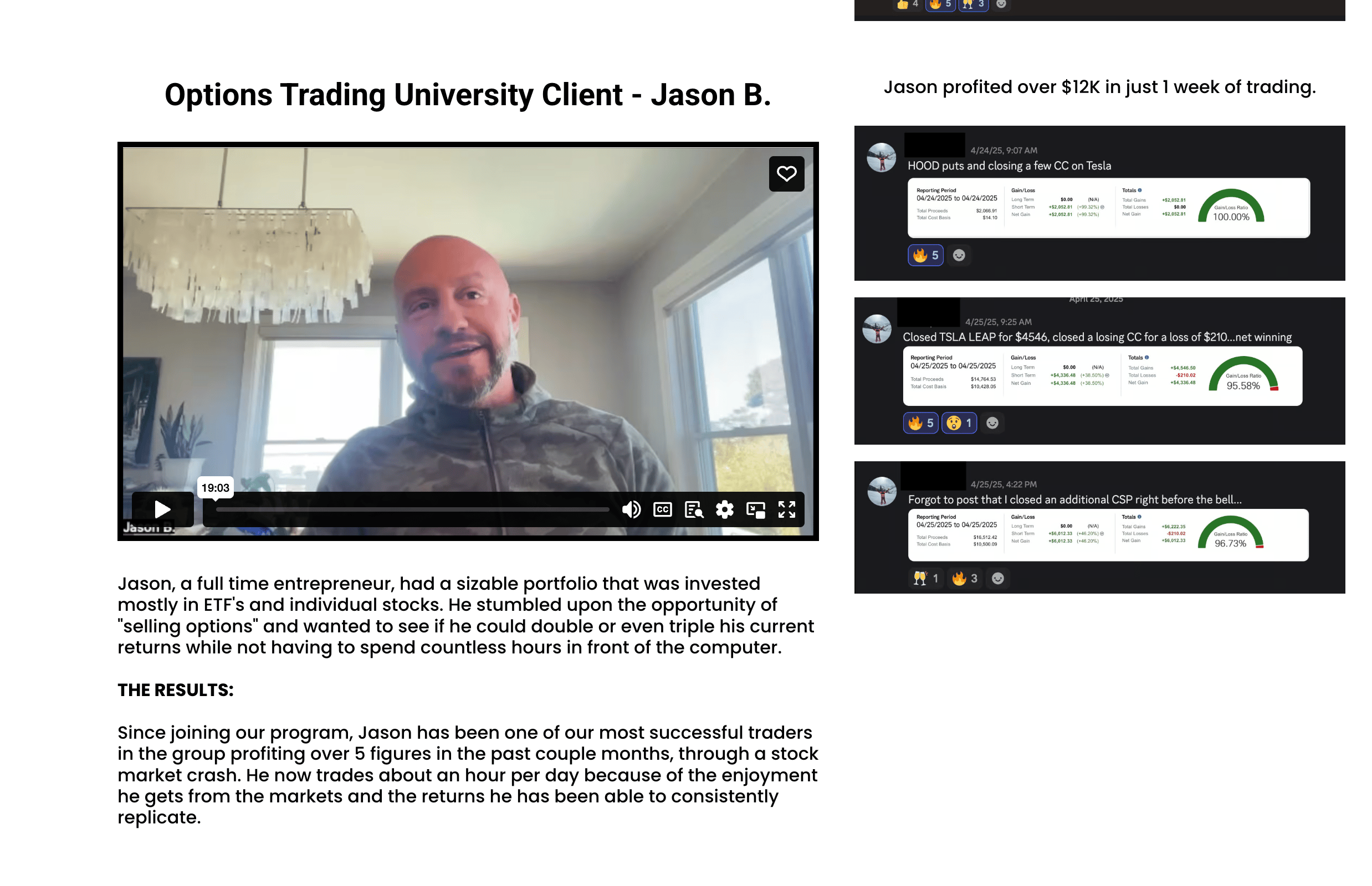 Jason joined during the tariffs crash and stayed consistent through volatility. In 2025 alone, he generated over $500,000 in profits and continues to stack consistent five-figure months by following the OTU system with discipline.