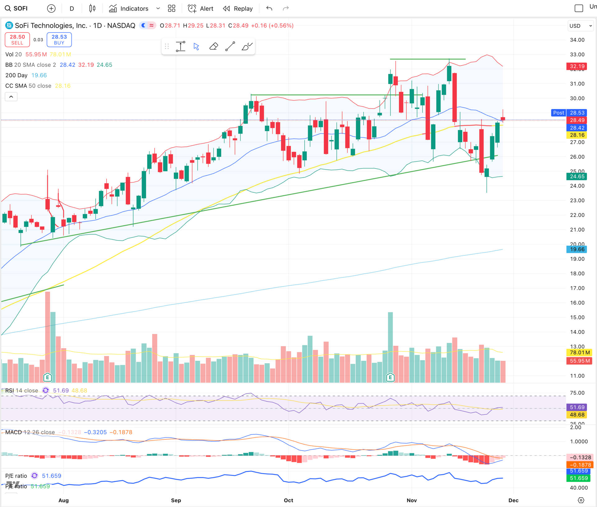SOFI is currently sitting right at its mid-Bollinger Band, offering a clean technical level to defend. With rate cut odds high for December and three potential cuts projected for next year, SOFI stands to benefit meaningfully from a lower-rate environment. Even if December does not deliver a cut, the broader trend supports upside for the stock, making this a compelling premium-selling opportunity.