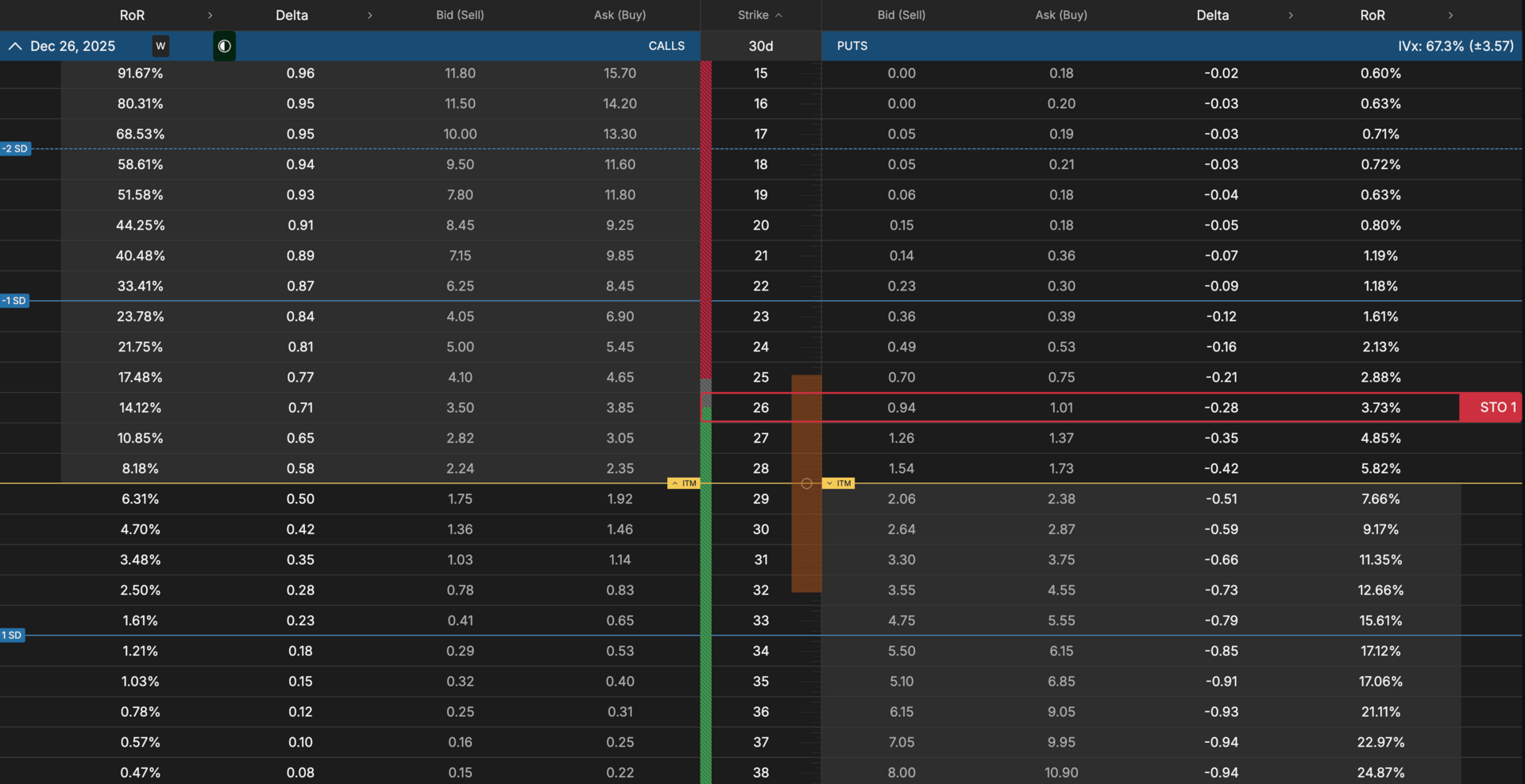 Risk: Assignment risk below the 26 level if SOFI sells off into expiration