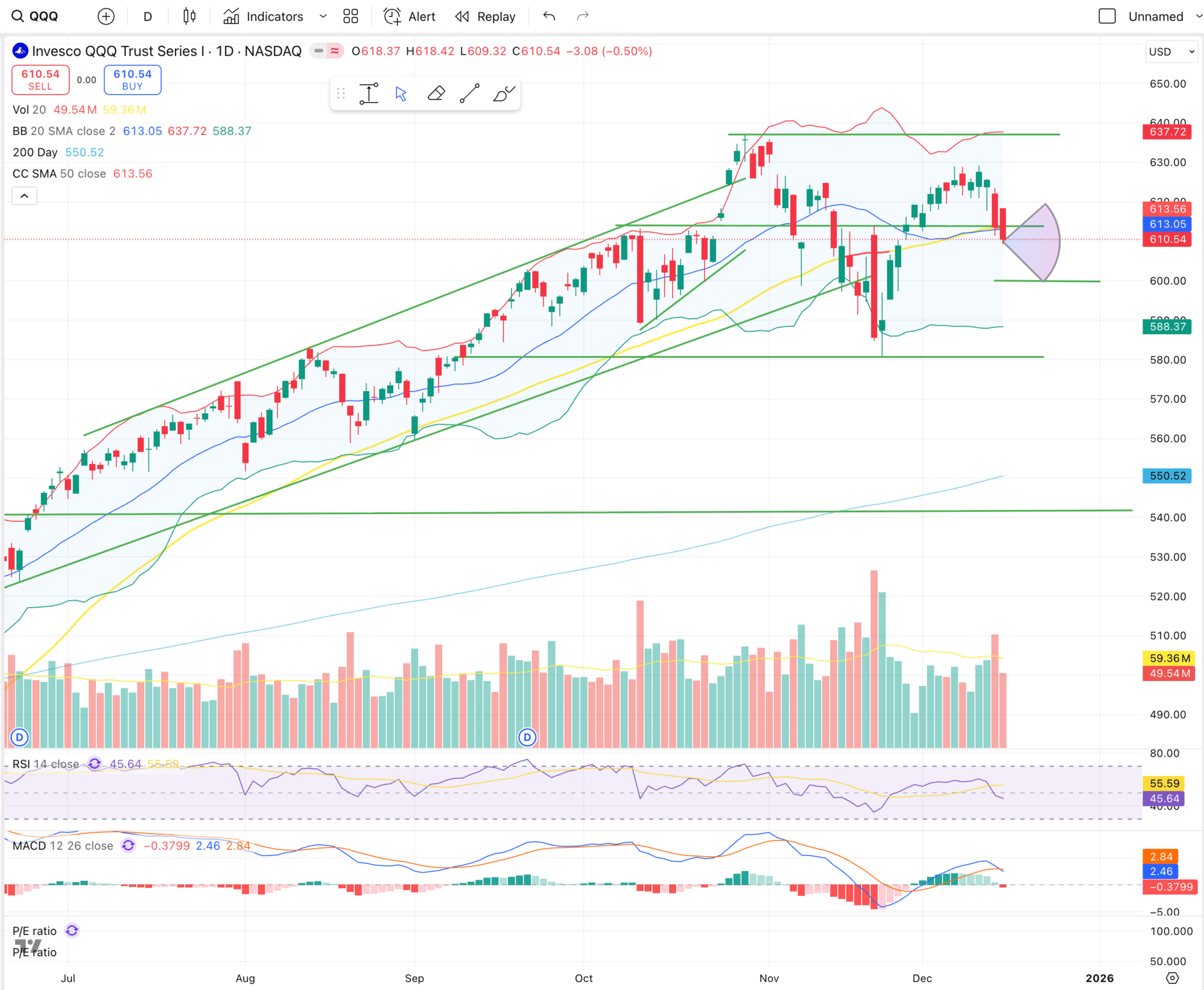 $VIX ( ▲ 4.83% ) closed today around 16.49, but a spike above 20 is absolutely possible, and that would be a level where I’m comfortable starting to deploy capital. I currently have roughly 19% cash on the sidelines and plan to stay patient rather than force trades with QQQ finishing around $610 and the MACD crossing bearish.