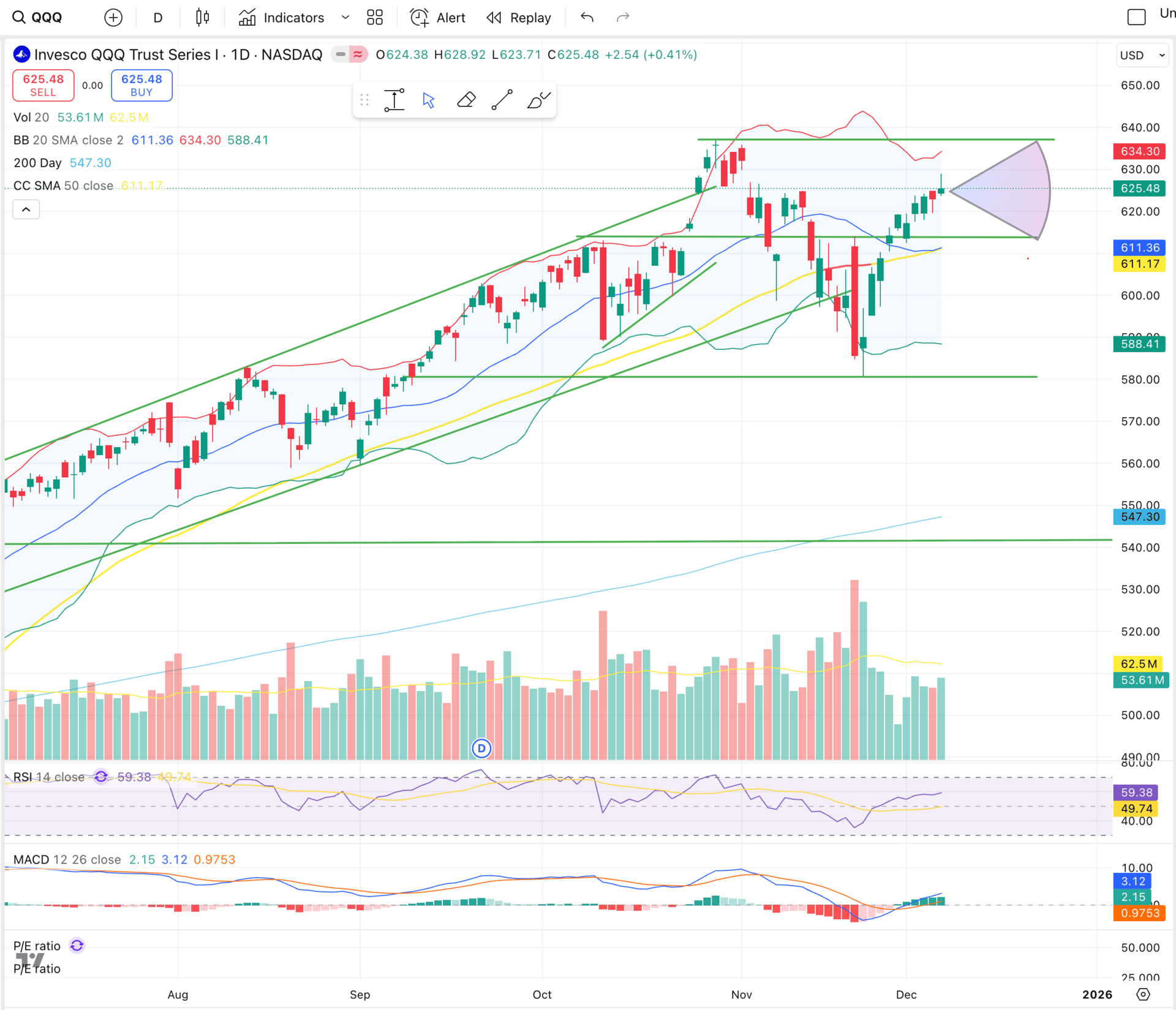 $QQQ ( ▲ 0.41% ) looks poised to retest the 637 all-time high, with only a slim 10 percent chance that a surprise no-cut scenario sends it down toward 613 or even 600. The best hedge against unexpected volatility is staying aligned with the $VIX ( ▼ 2.34% ) cash allocation levels. I am currently holding 18 percent cash, with 20 percent being ideal at these VIX readings. VIX remains in the 15s, and if it breaks below 14, the probability of new market highs increases significantly as fear gives way to accelerating greed.