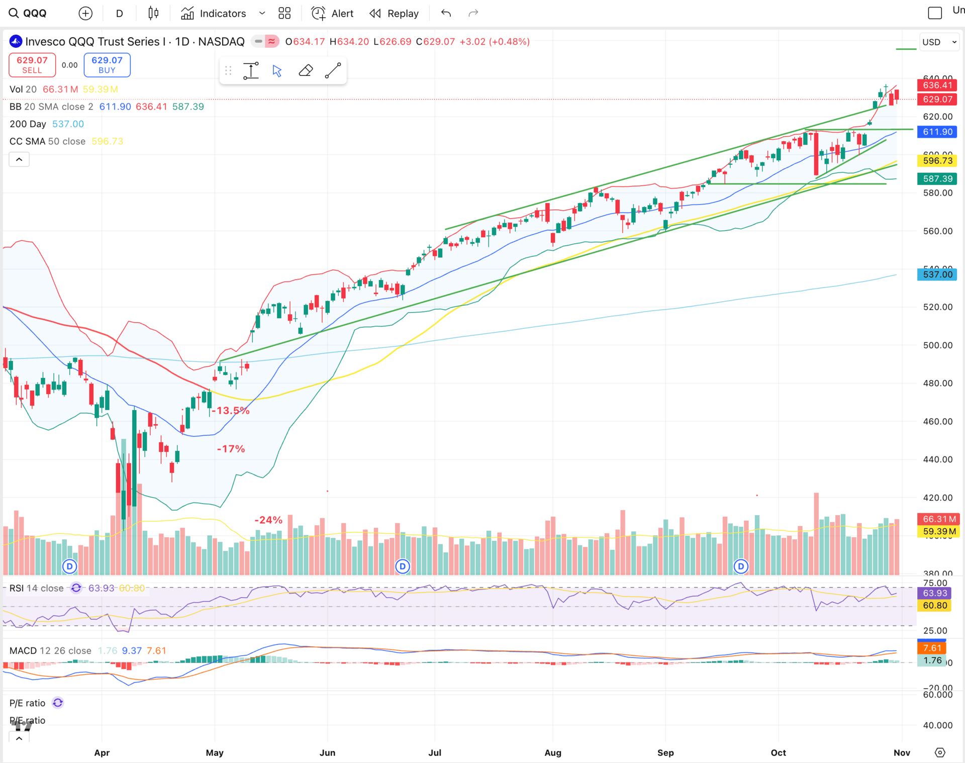 $QQQ ( ▲ 0.48% ) is trading around 629 and struggling to break through the 636 resistance level. If earnings come in weak, we could easily see a pullback toward 613 before the next rally. This would be a healthy setup heading into what I still expect to be a strong Christmas run.