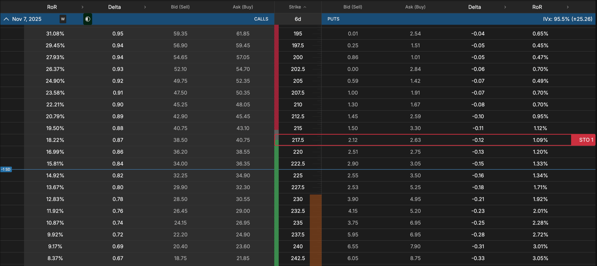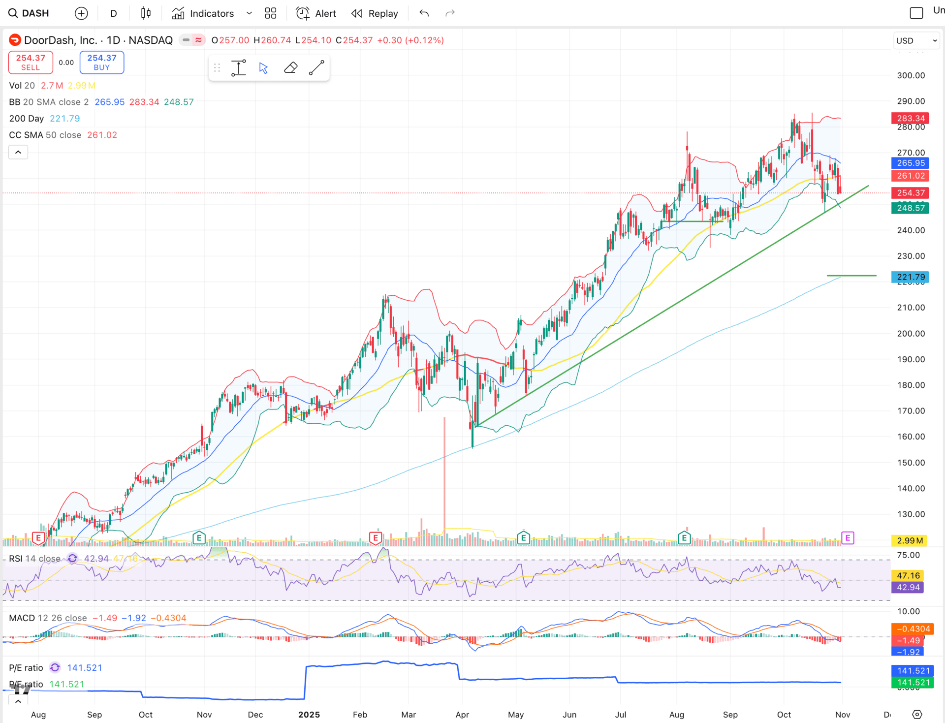 DoorDash is currently trading near $254, right above its lower Bollinger Band. Selling the 217.5 put keeps you safely outside the expected move while earning 1% in just three days on a strong company. This is a quick, low-risk setup that I’m personally taking ahead of earnings.