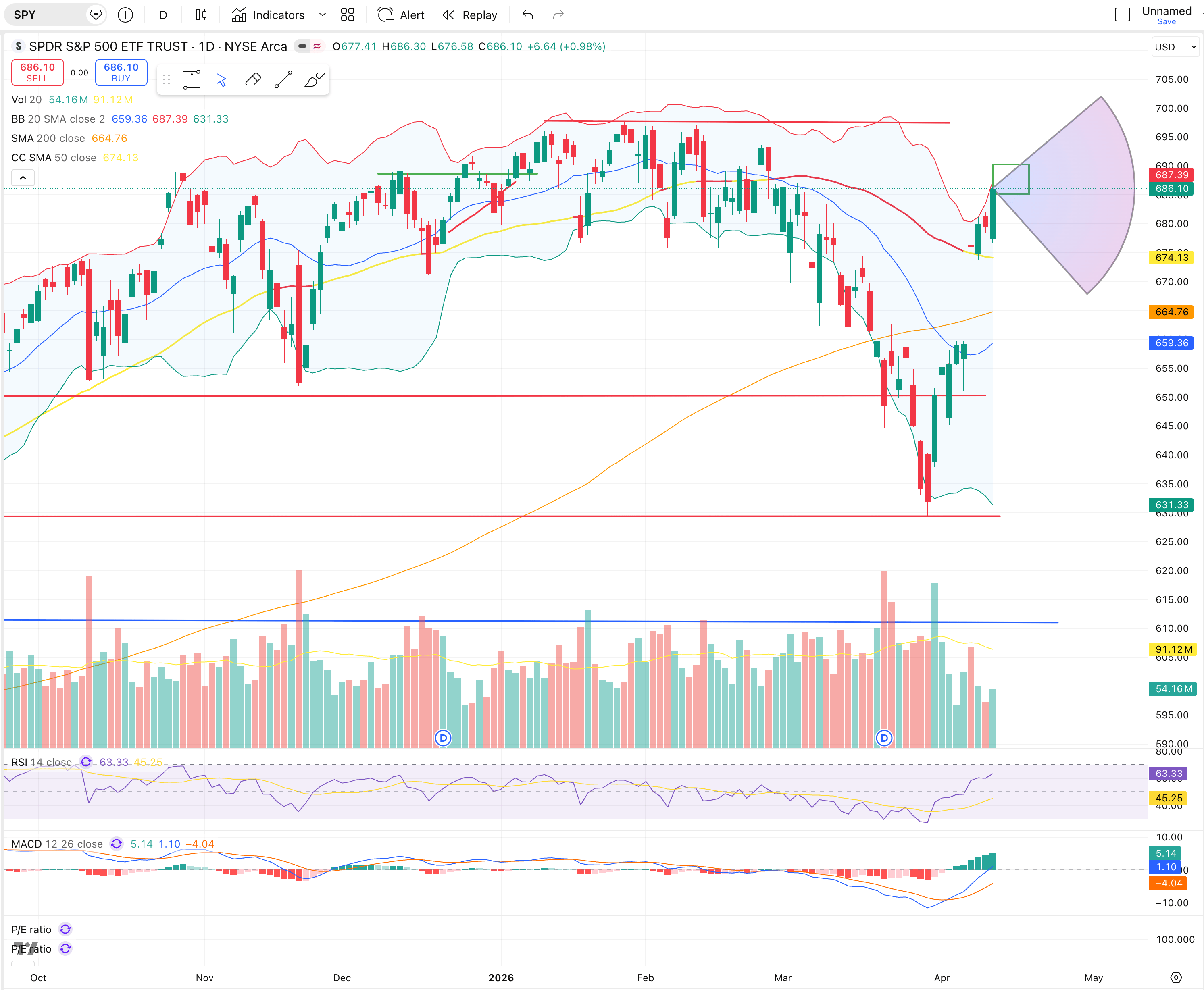SPY approaching RSI overbought, strong MACD bullish trend