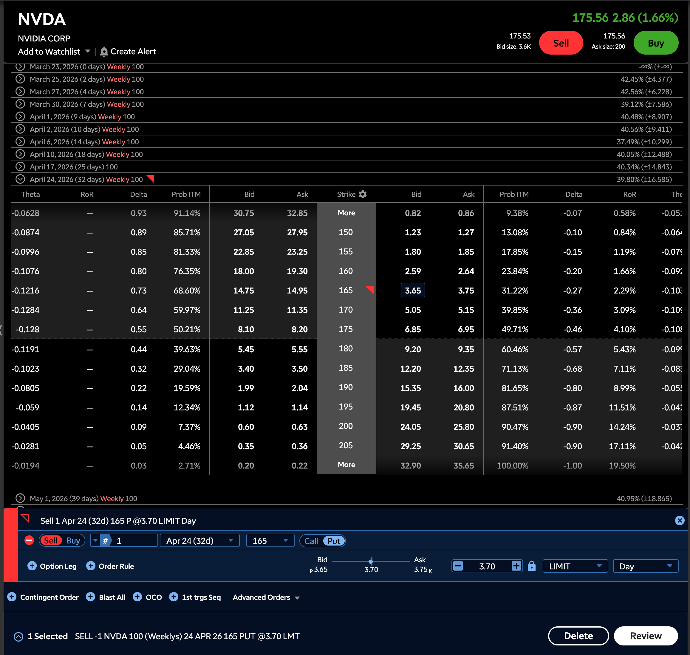 Risk: Assignment at 165, which would require purchasing 100 shares at that level