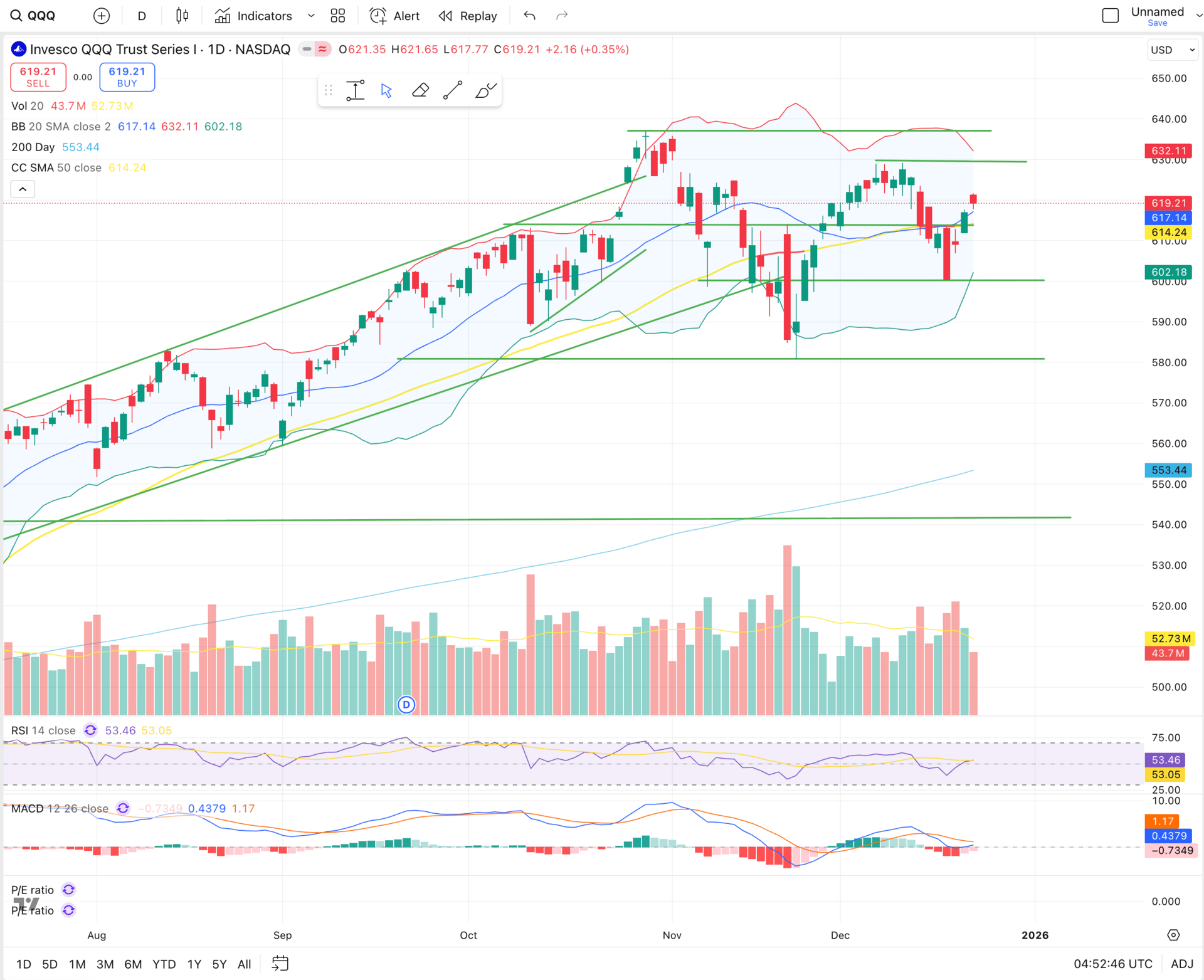 That pullback doesn’t need to be dramatic to create opportunity, which is why I’m prioritizing elevated cash levels right now. I’m currently sitting at 23.5% cash and plan to move closer to 30% by the end of the week as positions get called away. On the technical side, $QQQ ( ▲ 0.48% ) could drift up toward 629 by the end of the week, possibly a bit higher if momentum surprises to the upside, but I’m not expecting a powerful Christmas rally. Volume remains light, RSI just made a bullish crossover, and MACD is close to confirming as well, which supports some upside drift while we stay disciplined on risk.